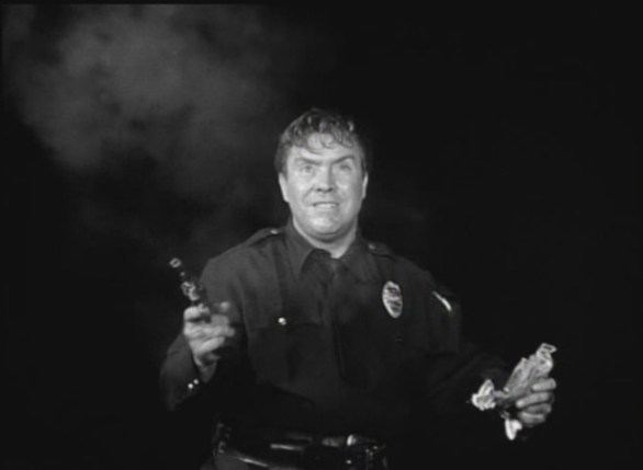Apparently Eddie has a long list of kills as a police officer. The scenes that take place in the precinct have a very Detective Story flavor to them. A day in the life feel. Agar is the young cop that Eddie has tutored and while Agar believes his teacher to be a great cop he has his doubts as to the number of killings to his credit. Aside from Agar, Eddie doesn’t appear to have to many friends on the force though he does have a girl he’s looking to settle down with played by Marla English. We’ll get a quick glimpse of Eddie’s temper when he discovers she’s moonlighting as a cigarette girl at a Gentleman’s Club.