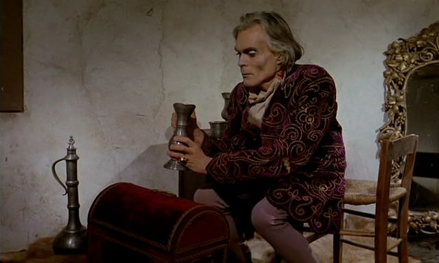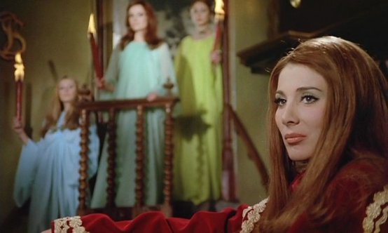 Awaiting Saunin at the castle are three brides. Just like in Stoker’s version. Now before we’re to meet our title character our demented dwarf takes his pleasures by having the three brides in colorful negligees engage in some sensual petting. And while he’s not snatching flies and wishing for a kitty cat, his character is most assuredly inspired by Stoker’s Renfield. Now that we’ve had a pleasurable romp it’s time for Morgana to make her grand entrance as played by Dominique Delpierre. Perhaps the three brides should give Saunin a sponge bath so she can be appropriately attired and looking beautiful for their Mistress.