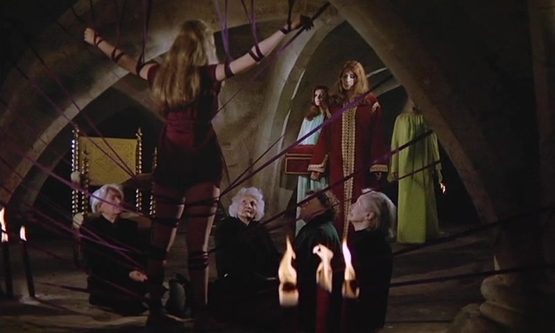 The topic of immortality is prevalent as Morgana attempts to win over Saunin with stories of remaining young and beautiful as opposed to growing old and haggard like the crones that live in the castle dungeon. These are the women who have rejected Morgana who now live below as if they are in a bottomless pit of hell. On the other hand there is a section below that is lined with beautiful women. A harem for the Mistress. If not a harem then how about an all girl hippie commune. One that allows for plenty of sensual dancing and petting of breasts. No this isn’t an outright porno film but one of those French efforts that plays like a vampiric tale from Jean Rollin with a more linear script. Morgana is less dreamy than Rollin yet still takes place in a parallel universe.