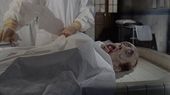 Following a quick autopsy to confirm that the farmer’s body is minus any bones, the quartet head to the estate that houses our cancer research. It’s here that they’ll find what’s left of the lab technicians. All reduced to boneless corpses. A quick note on the brave Peter Cushing. While the group descend the stairs to the estate’s lower depths the first door they see looks to be a sturdy and made of steel with a clear warning labeled across it, KEEP OUT RADIATION DANGER.” What’s the first thing that Dear Peter does? Opens it of course and charges in to discover there’s nothing amiss here. Man’s got guts! Not the same down the hall where they find what’s left of the lab with the jellied techs.