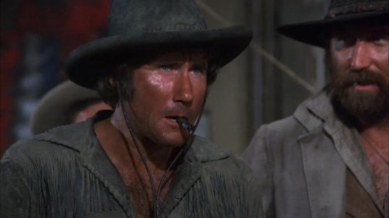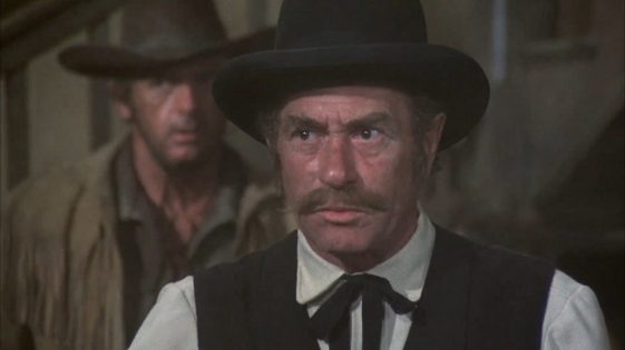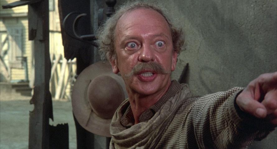 While Knotts may have been the selling feature of the film, he and Elam are secondary characters serving as comic relief to leading man Jim Dale who is playing not two but three roles! It all starts with Dale as a fragile old timer in the mold of a Gabby Hayes who just happens to own a frontier town and all the lands surrounding it. He’s got a rattlesnake mean son also played by Dale who looks as if he’s just walking in from a Spaghetti western shoot.