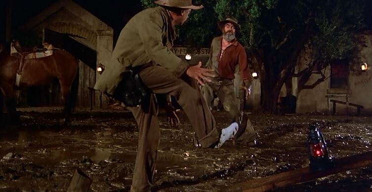 Where’s Don Knotts fit into all this? He’s the trembling town sheriff. Yes he’s had a promotion from his days as Deputy Fife in Mayberry. He’ll give us the classic Knotts’ tough guy look with the jutting lower lip when he crosses paths with Elam’s outlaw on several occasions over the course of the film’s running time. Somehow their gun draws in the middle of the street turn into slapstick laughs for the whole family. Neither with the guts to really chance pulling their weapon. None better then when they tangle on a stormy night trying to navigate their steps in what has become a huge mudhole of a street where a cowboy can lose his boots in the struggle.