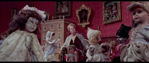 Here’s an Amicus thriller by way of writer Robert Bloch that I wish I had seen as a youngster. It would have scared the hell out of me leaving me fond memories in the years to come. I can just see myself curled up in the corner of our couch and dashing down the hallway to the safety of my bed after it was over. Not even daring to look at the closet where vague images and shapes lurk in the darkness. Such is the power of a creepy old hag sans makeup in a wheelchair living in a house surrounded by dozens of dolls of all shapes, sizes and facial expressions.