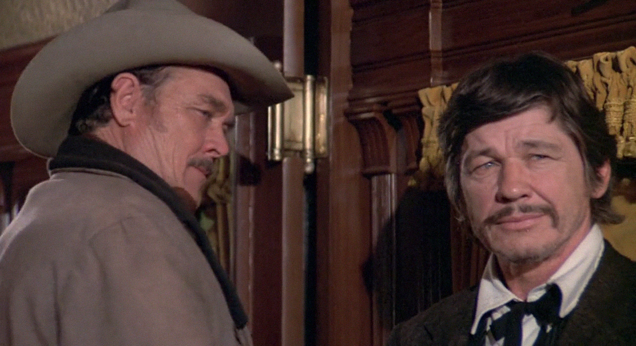 It’s a rather small train with just a few cars including the fancy parlor like one where a good majority of our verbal exchanges will take place with Bronson at first cuffed, tied and relegated to the floor which results in a sympathetic comment from Ireland on his behalf to the mean spirited Johnson. Result? A big smile from Charlie. Who says he never smiled on camera?
