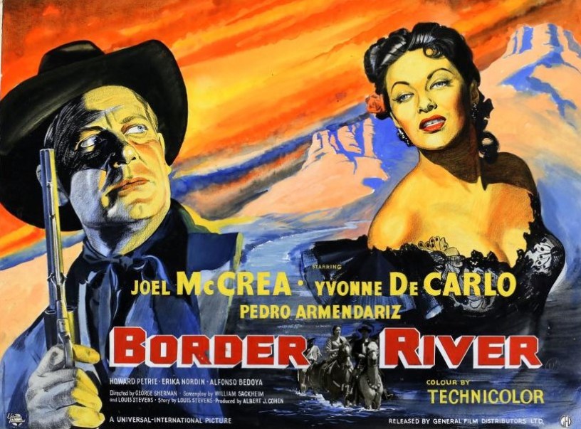 Universal-International Studios proved to be a western fan’s best friend during the 1950’s and a film like Border River is a fine example of just what the company was putting into movie houses at the height of the western’s popularity. In this case a well established leading man and an equally well known beauty as his leading lady backed with plenty of action and gunplay.
