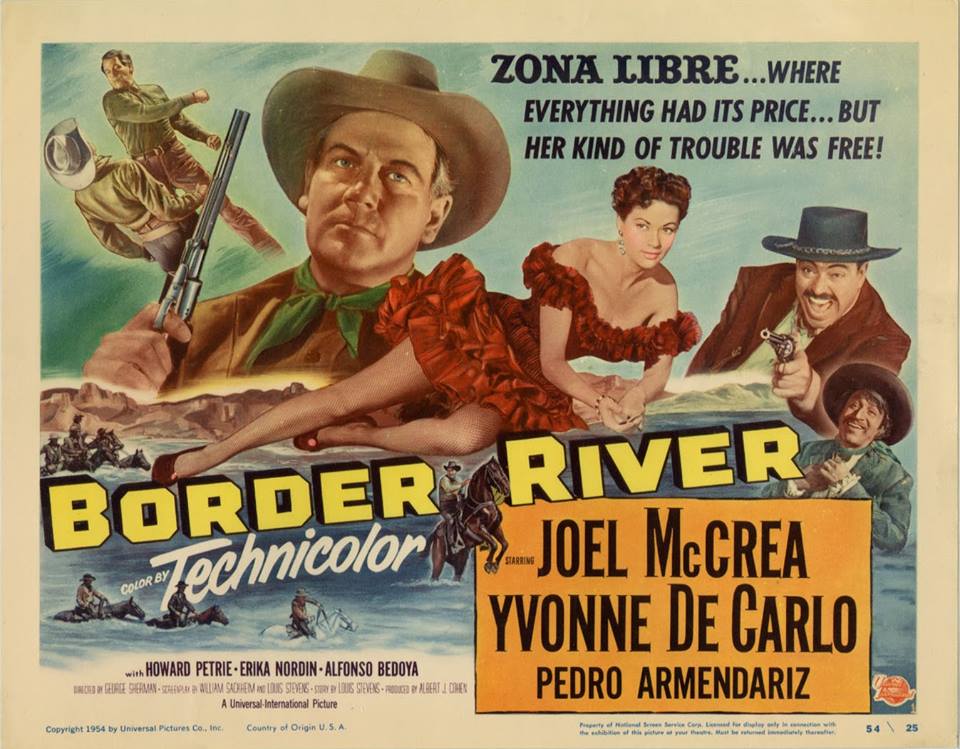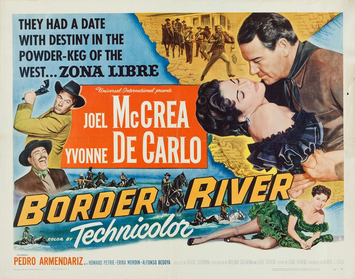 Border River’s director, George Sherman, was a long time veteran of the western. He cut his teeth on the genre in the 1930’s helming many of The Three Mesquiteers films starring John Wayne. As the years passed he’d occasionally stray to action pictures like The Bandit of Sherwood Forest with a young Cornel Wilde or Against All Flags with Errol Flynn but inevitably be back in the saddle. Prior to Border River he had worked with Yvonne on Black Bart and River Lady. Both released in 1948 followed by Calamity Jane and Sam Bass in ’49. In 1951 they worked together one last time on Tomahawk with Van Heflin. Going full circle, Sherman, would be given the job of directing one of the Duke’s best remembered films from his later years, Big Jake, in 1971.
