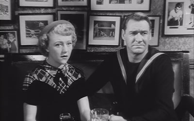 Aside from our British cast, we have one American actor on board. It’s Mr. Sonny Tufts looking as if he’s just walked off the set of 1944’s Here Come the Waves where he co-starred with Bing Crosby as a couple of navy men chasing girls and singing songs. Here he’s a little heavier I suppose but still behaving as if he’s in a 1944 light hearted musical at Paramount. Cliched? How about while on shore leave he meets a lonely waitress and in a matter of screen seconds the two are married and having rice thrown their way by members of the crew.