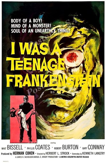 I is for …. I Was a Teenage Frankenstein. Title says all in this low budget 1957 drive-in special from producer Herman Cohen.