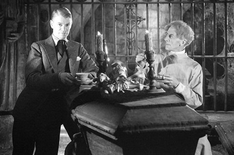 T is for …. Thesiger. Along with Karloff, Whale and Miss Lanchester, Ernest Thesiger (1879-1961) was also British born and signed on to The Bride of Frankenstein as the memorable Dr. Pretorius. It’s his twisted scientist who gains the Monster’s trust and blackmails Colin Clive into creating a mate for the Monster. You will of course recall the little people Thesiger has bottled up in one of the film’s more amusing scenes. “Sometimes I have wondered whether life wouldn’t be much more amusing if we were all devils, no nonsense about angels and being good.”