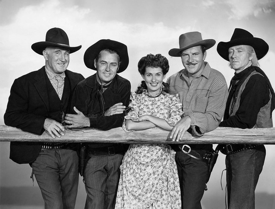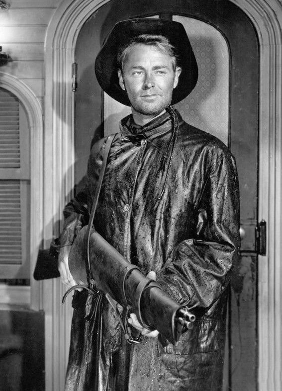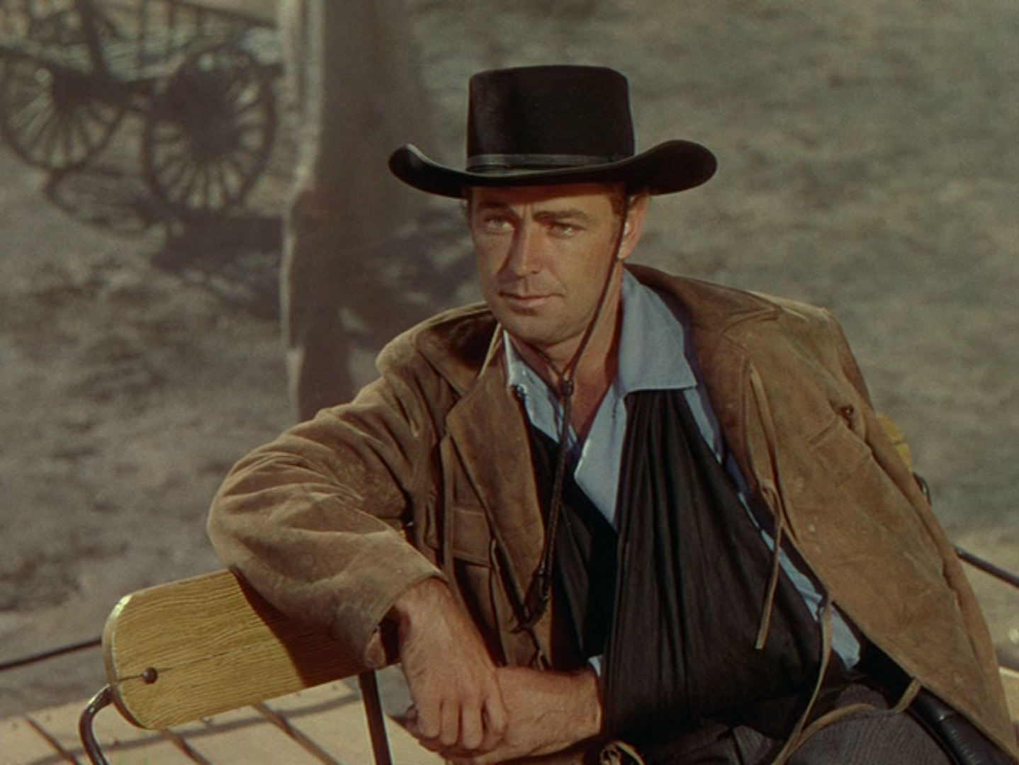 Ladd makes a stellar entrance as he looks up into the camera following an attack on his life. He’s been bushwhacked and thought to be dead by a trio of brothers he’s on the hunt for. Ladd is a railway detective aiming to take down the Barton Brothers who are wanted men for a series of train robberies. In the dead of night he’ll catch a train and reunite with an old saddle pal played by Robert Preston. Moments later in an explosion of gunfire he’ll kill two of the Barton boys and take a bullet.