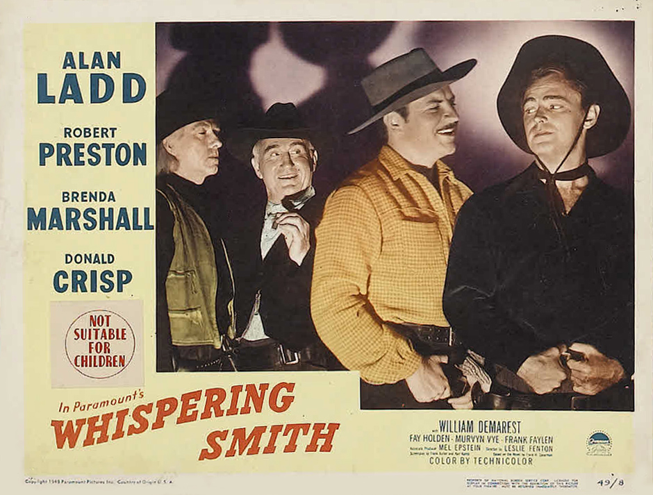Director Fenton had previously worked with Ladd and his frequent co-star, Veronica Lake, on 1947’s Saigon. Following Whispering Smith he’d direct Miss Marshall’s then husband William Holden in the 1949 western release Streets of Laredo. On the topic of Brenda Marshall, I always felt she was a dark haired stunner. Her career mainly spanned the 1940’s. She scored some leading roles opposite the biggest names of the era including Errol Flynn in The Sea Hawk and played Cagney for a fool in Captains of the Clouds. The latter film capturing her beauty magnificently in technicolor against the backdrop of the Canadian wilderness.