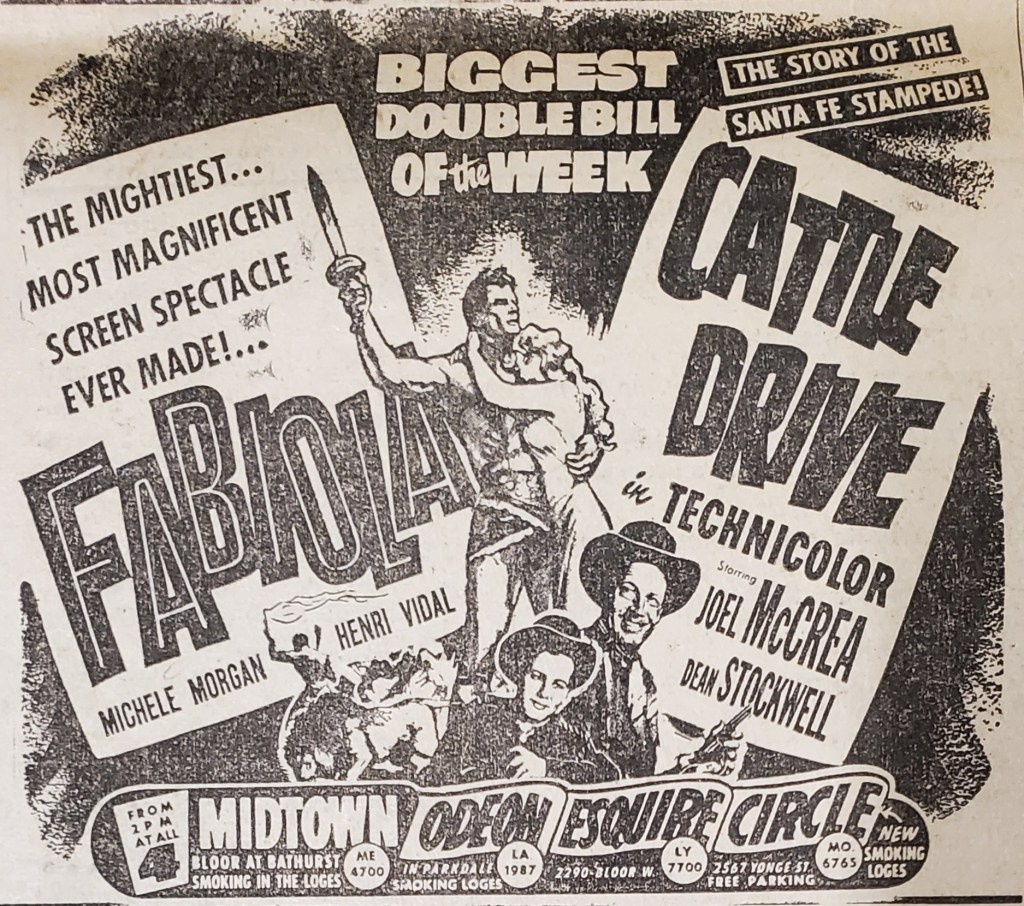 I’ve no idea what the movie Fabiola is about but I have seen Cattle Drive with Joel McCrea. Kind of a western Captains Courageous with Dean Stockwell playing a spoiled little rich kid on the title cattle drive.