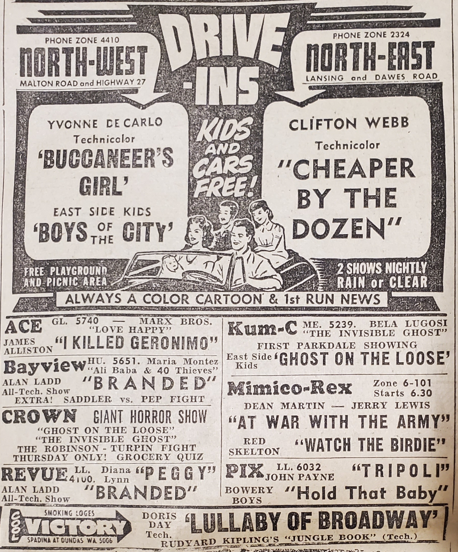 I love to scan these ads looking for the hidden gems. Like John Payne in Tripoli. Bela Lugosi in The Invisible Ghost. Better still, the Giant Horror Show with a pair of Bela films, a grocery quiz AND a Sugar Ray Robinson fight.