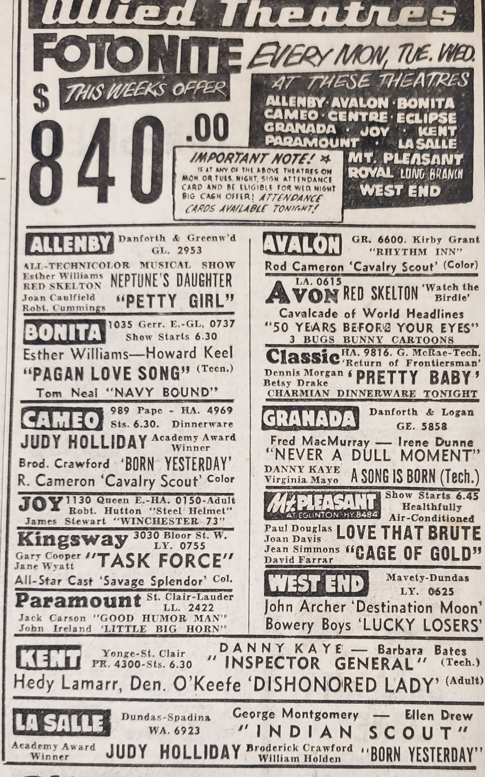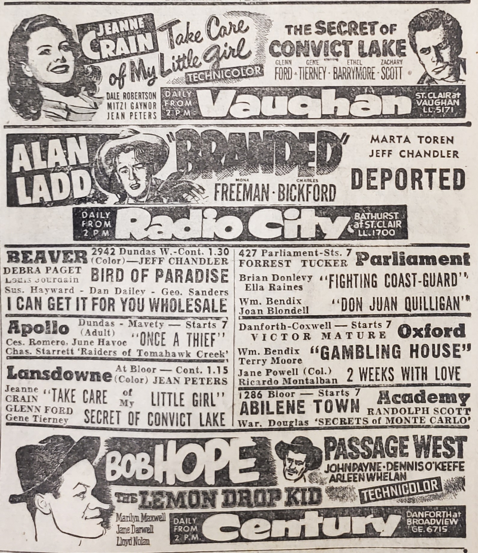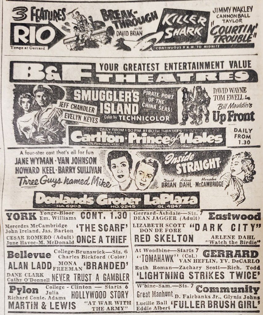More Jeff Chandler action. An early Jaws rendition called Killer Shark? Not quite, it’s a Monogram special starring Roddy McDowall from director Budd Boetticher. Richard Conte and Julie Adams in Hollywood Story interests me and I’m drawn to the ad for Dark City starring Lizabeth Scott and Don De Fore. I guess the unknown leading man making his film debut didn’t warrant any attention just yet. A Mr. Charlton Heston. Ever seen the singing cowboy Jimmy Wakely (misspelled in ad) and his sidekick Dub “Cannonball” Taylor in a western? Now’s your chance. So much to choose from with so many favorites of yesteryear.