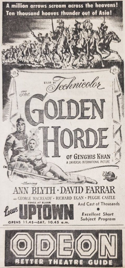 Judging by the size of the ad, The Golden Horde, was getting the BIG release treatment. With all due respect to Ann Blyth whom I truly like on camera, the film is lacking real star power and maybe that’s why I’ve never seen it let alone heard of it as far as I can recall.