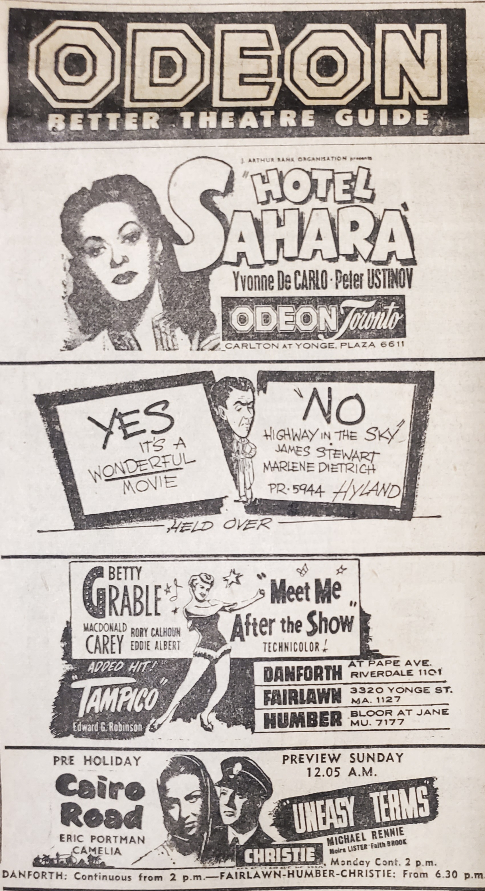 Aside from Yvonne De Carlo, there are a number of things that caught my eye on this next ad. I like that artwork on the Jimmy Stewart title, No Highway in the Sky, which brings to mind it’s capitalizing on the film It’s a Wonderful Life. A film I’ve been led to believe wasn’t really much of a success on it’s original go around and never really found an audience till years later on TV and it’s public domain status during the early years of the VHS tape. This would lead me to believe otherwise. ** Also, I’ve yet to see the Edward G. Robinson film, Tampico. ** Lastly I had to do some research on the one name actress Camelia appearing in Cairo Road. I’d never heard of her. Born in Egypt, she made but a handful of films and sadly by 1951 had already passed away in a plane crash at the age of 30. By all means if you’re familiar with her story, let me in on it.