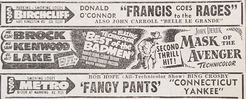 Back to scanning ads to see what treasures lie within. Love That Brute with Paul Douglas playing like Brod Crawford in Born Yesterday might be a hoot. The gem here might be Jean Simmons in Basil Dearden’s Cage of Gold. A quick check reveals it’s a blackmail plot. Any sci-fi fans who made the trip with me are sure to be checking out Destination Moon. Maybe a Rod Cameron western in color no less, Cavalry Scout?