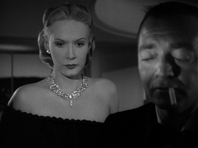 First off is Dan Duryea, her ex-husband who is refused entry by the doorman of the building which sends him off to the bottom of a whiskey bottle. Then along comes Peter Lorre who easily gains access and lastly John Phillips who will arrive too late to confront her about a little secret that she shares with him. You see, she’s already been strangled by the time he enters her apartment. He’ll trail a mysterious figure out the door who has run off with a broach he had first seen on the body before it’s disappearance on a second look