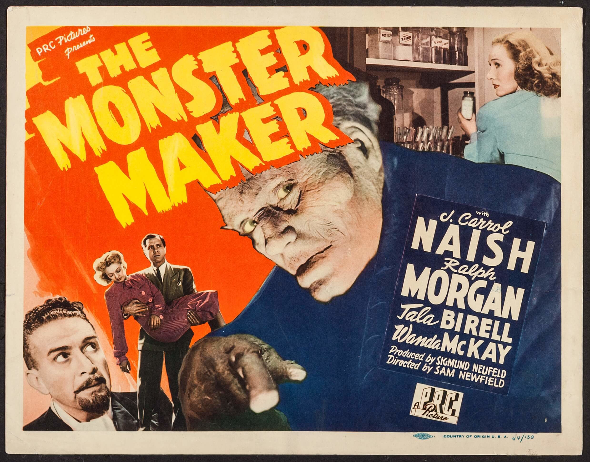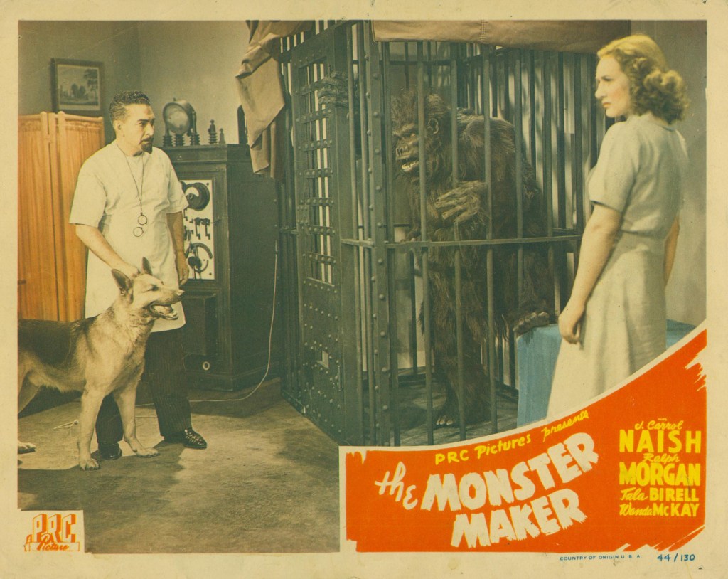 Our man in the gorilla suit was Ray Corrigan. A one time member of the western trio, The Three Mesquiteers, with John Wayne and Max Terhune, Corrigan surely owned the gorilla suit seen here. He seemed to have cornered the market of gorillas on camera. According to the IMDB he not only put the suit on here for Monster Maker but also in The Ape with Boris Karloff, The Strange Case of Dr. Rx, the superior of it’s type, Dr. Renault’s Secret once again with Naish, Dizzy Detectives with the Stooges, Captive Wild Woman, She’s For Me, The Phantom, Nabonga, The Hairy Ape, The Monster and the Ape, The White Gorilla, White Pongo, Tall Dark and Gruesome, Miraculous Journey, Congo Bill, Crime On Their Hands – again with the Stooges, The Lost Tribe with Johnny Weissmuller, Microspook, Zamba, Forbidden Jungle and the must see Bela Lugosi Meets a Brooklyn Gorilla. He even played the monster from outer space in the highly influential, It! The Terror From Beyond Space.