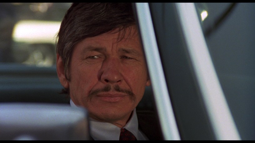 There’s a big canvas at play in Gerald Wilson’s screenplay adapted from the book written by John Gardner. The books original title is interwoven in an exchange between Bronson and Waite. When looking over a corpse in the morgue, Waite asks, “What hit him?” Bronson’s reply is the title of the source novel.