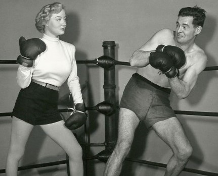 The Noir classic, The Set-Up, released in 1949 starred two of the genre’s best. Robert Ryan as the fighter and Audrey Totter as the woman in his life seen here having fun in a gag shot on set. The film itself is far more serious in tone.