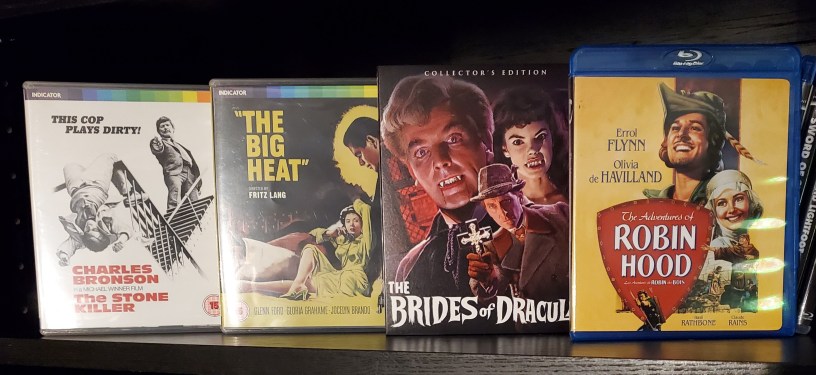 Old favorites I love to revisit that come with my highest recommendations included … Mystery Of the Wax Museum (1933), Out of the Past (1947), The Big Heat (1953), Black Sunday (1960), Ed Wood (1994), Mysterious Island (1961), The Howling (1981), Pray For the Wildcats (1974), Burnt Offerings (1976), The Fourth War (1990), The Big Lebowski (1998), Lon Chaney Inner Sanctum Series of 6 movies – Calling Dr. Death/Weird Woman/Dead Man’s Eyes/Strange Conflict/Pillow of Death/Frozen Ghost, Action Jackson (1988), Step Brothers (2008), The Raven (1963), The Black Room (1935), The Man With Nine Lives (1940), The Raven (1935), The Law and Jake Wade (1958), 4D Man (1959), The Black Cat (1934), Son of Dracula (1943), The Comedy of Terrors (1964), Daughters of Darkness (1971), The Adventures of Robin Hood (1938), Crossed Swords (1977), Welcome Stranger (1947), Going My Way (1944), The Green Slime (1968), The Jerk (1979), Escape From New York (1983), The Great Escape (1963) and Big Jake (1971).