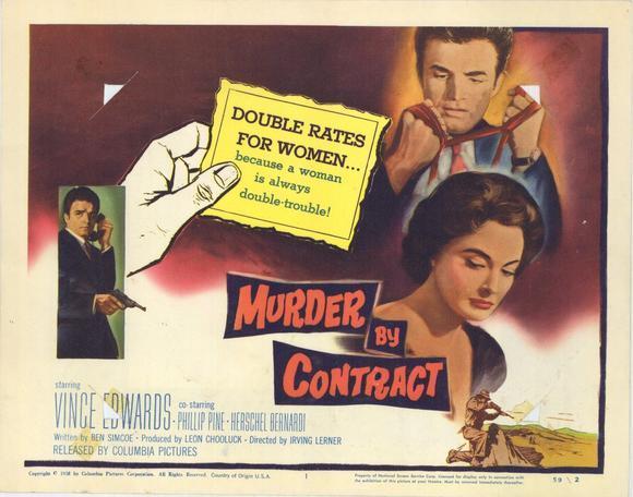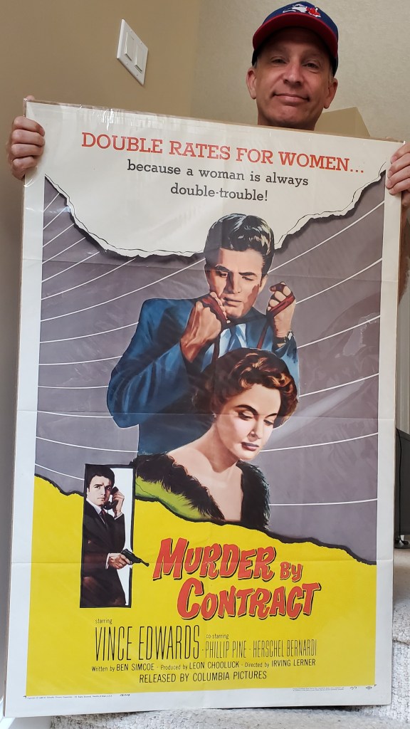 While his career seemed to lean towards television in the 60’s through to the 90’s with occasional movie roles like that of Maj. Bricker in the big budget war film, The Devil’s Brigade, or the grindhouse classic, The Police Connection in 1973, Vince Edwards had a run of fine crime dramas in the 1950’s. Kubrick’s 1956 classic The Killing standing tall among them. Others aside from Murder By Contract and City of Fear include costarring along with John Cassavetes in 55’s The Night Holds Terror, playing it tough in 55’s Cell 2455 Death Row and he even appeared opposite old pros Robert Taylor and George Raft in 54’s Rogue Cop.