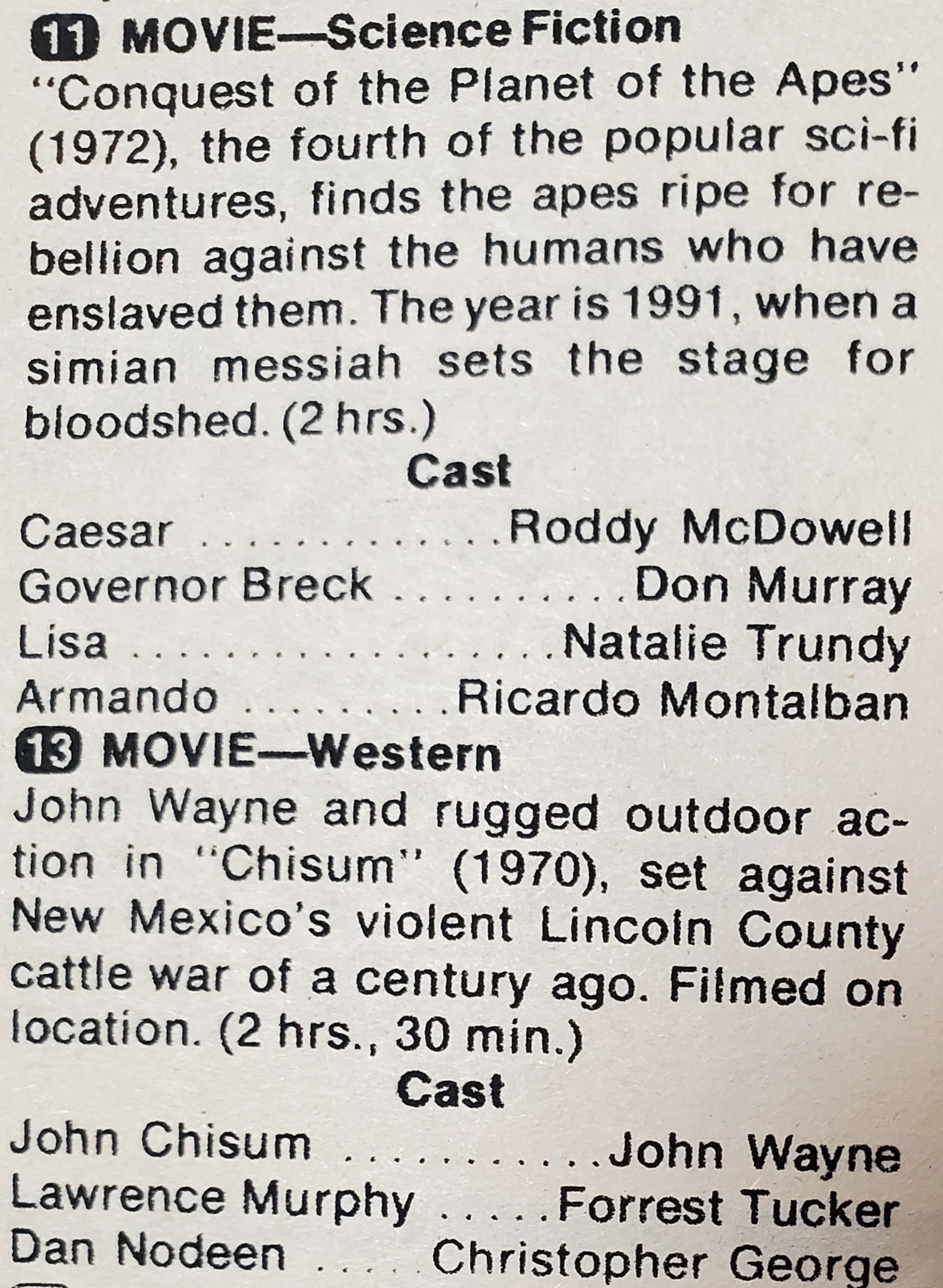 A tough decision for the 8PM time slot. The Duke or Roddy’s 4th instalment of the Planet of the Apes?