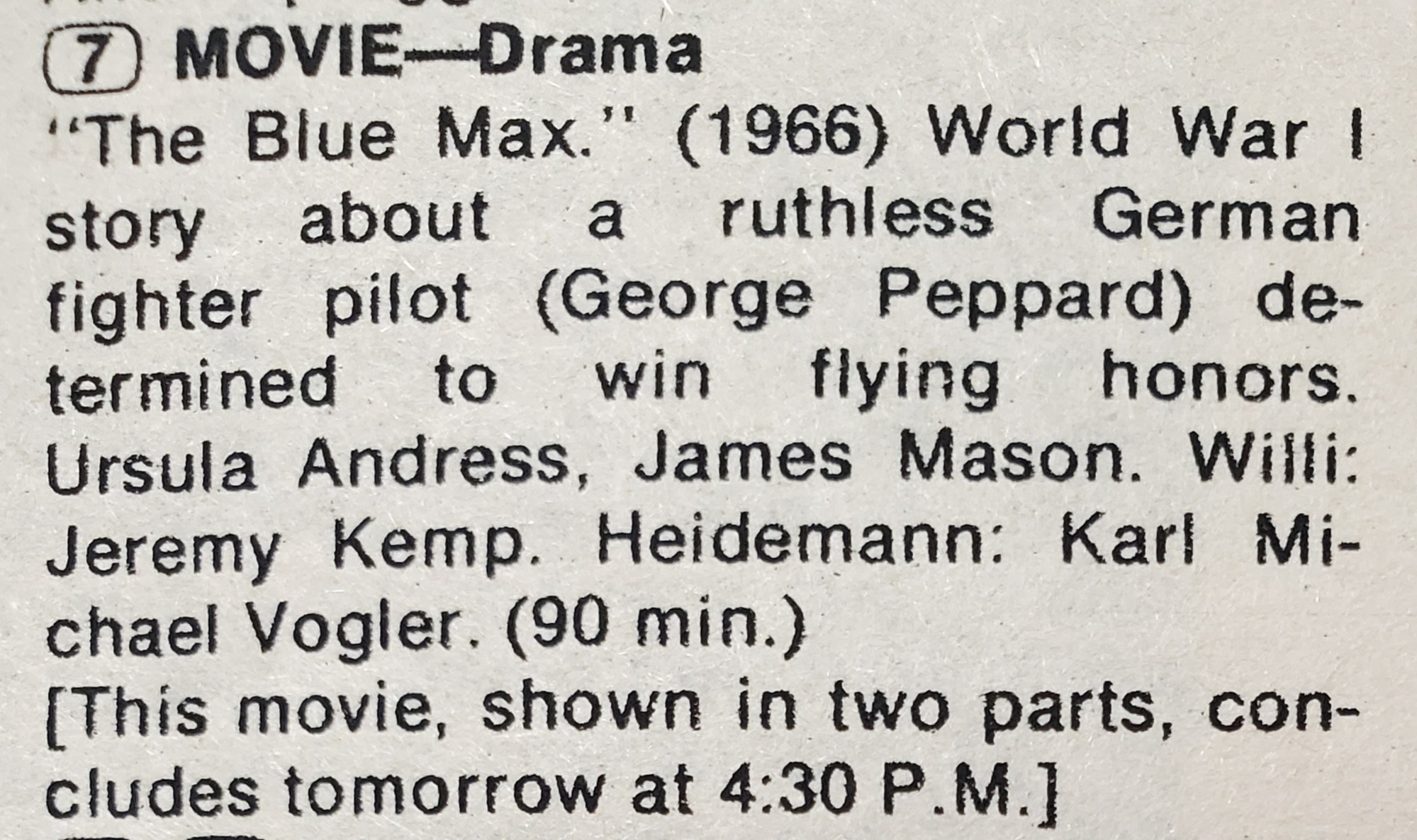 I can also recall this station out of Buffalo that played movies everyday in the 4 PM time slot and on many occasions they were epic in length and shown over the course of two days in a Part 1 and Part 2 fashion. Flicks like The Blue Max starring George Peppard which would years later prove to be the “biggest” original movie poster in my collection.