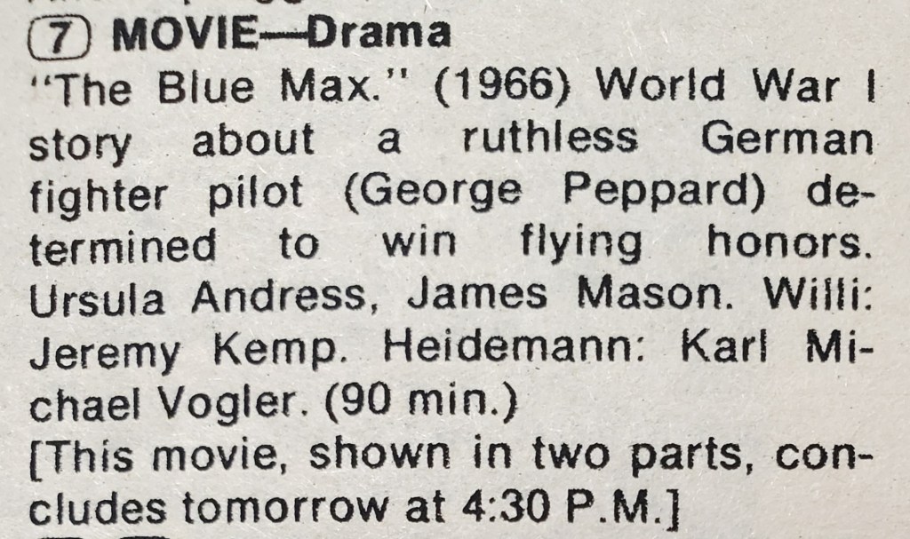 Don’t forget to catch part 2 of The Blue Max at 4:30 either.