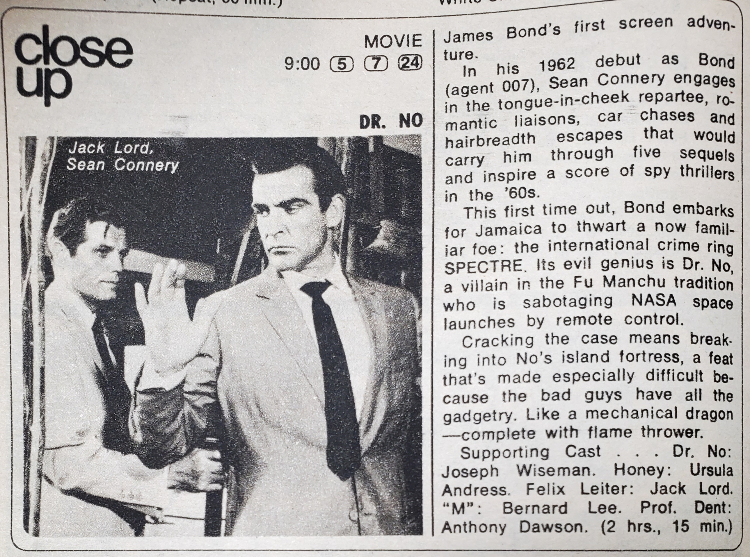 And for the big Sunday Night Movie of the Week it’s Bond, James Bond with Sean Connery in the series debut.