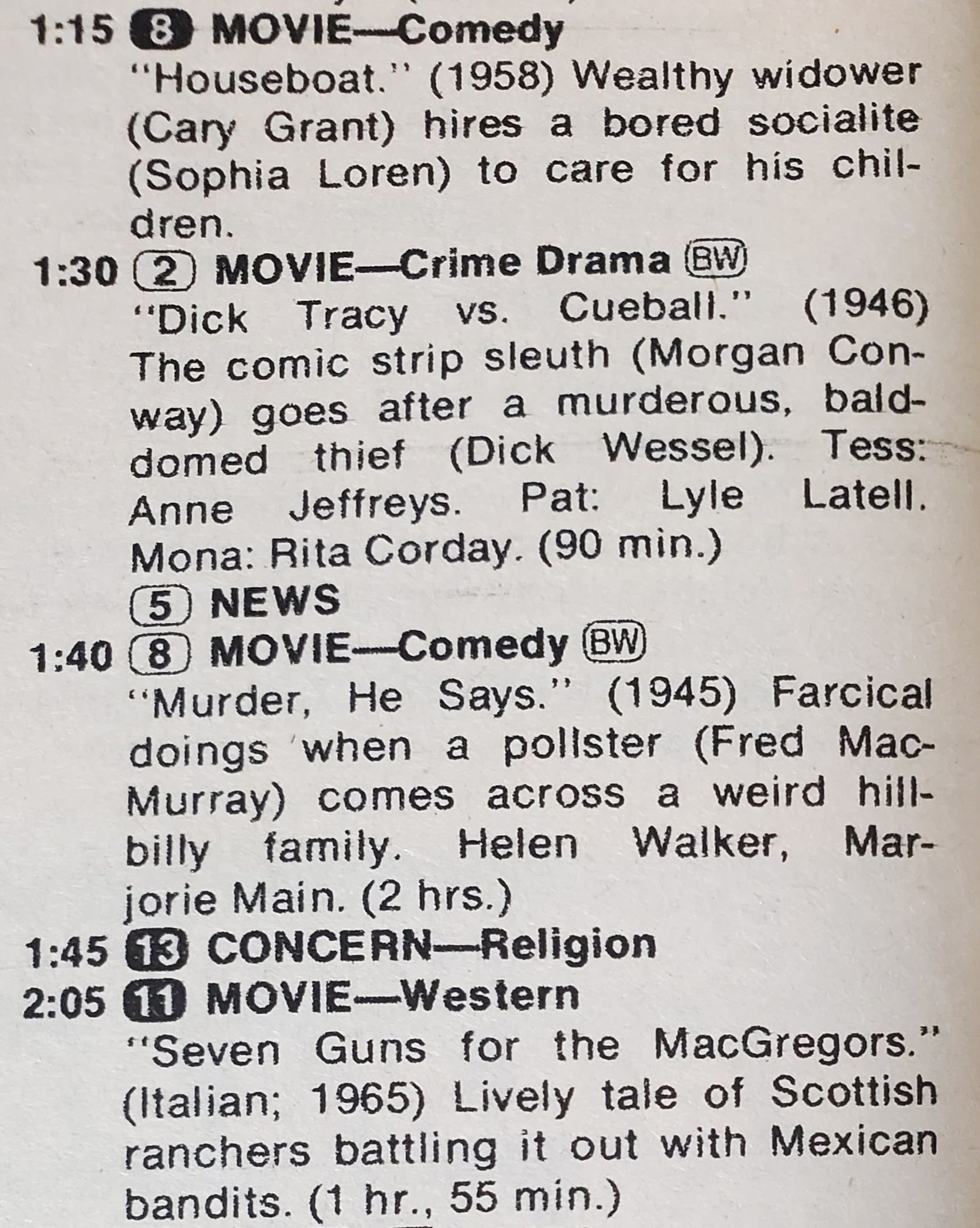 For you night owls closing out the week, here are the final four titles listed for the late late show in the early morning of Saturday the 16th. Sophia, Cary, Boris, MacMurray and a spaghetti western.