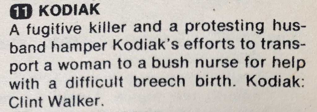 Other titles that jump from the page as the day goes by include Howie Meeker’s Hockey School, Lawrence Welk, Stompin’ Tom’s Canada, Emergency!, Chico and the Man and a couple of titles I had to look up including My Partner The Ghost and a short lived Robert Forster show titled Nakia.