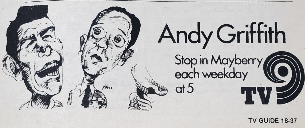I’d be back in school for the balance of the week so I’ll leave the daytime shows like Donahue, The Guiding Light and General Hospital to those who have the time. But at 5 PM each day I’d be happy to pay a visit to Andy and Don and the rest of the Mayberry family.
