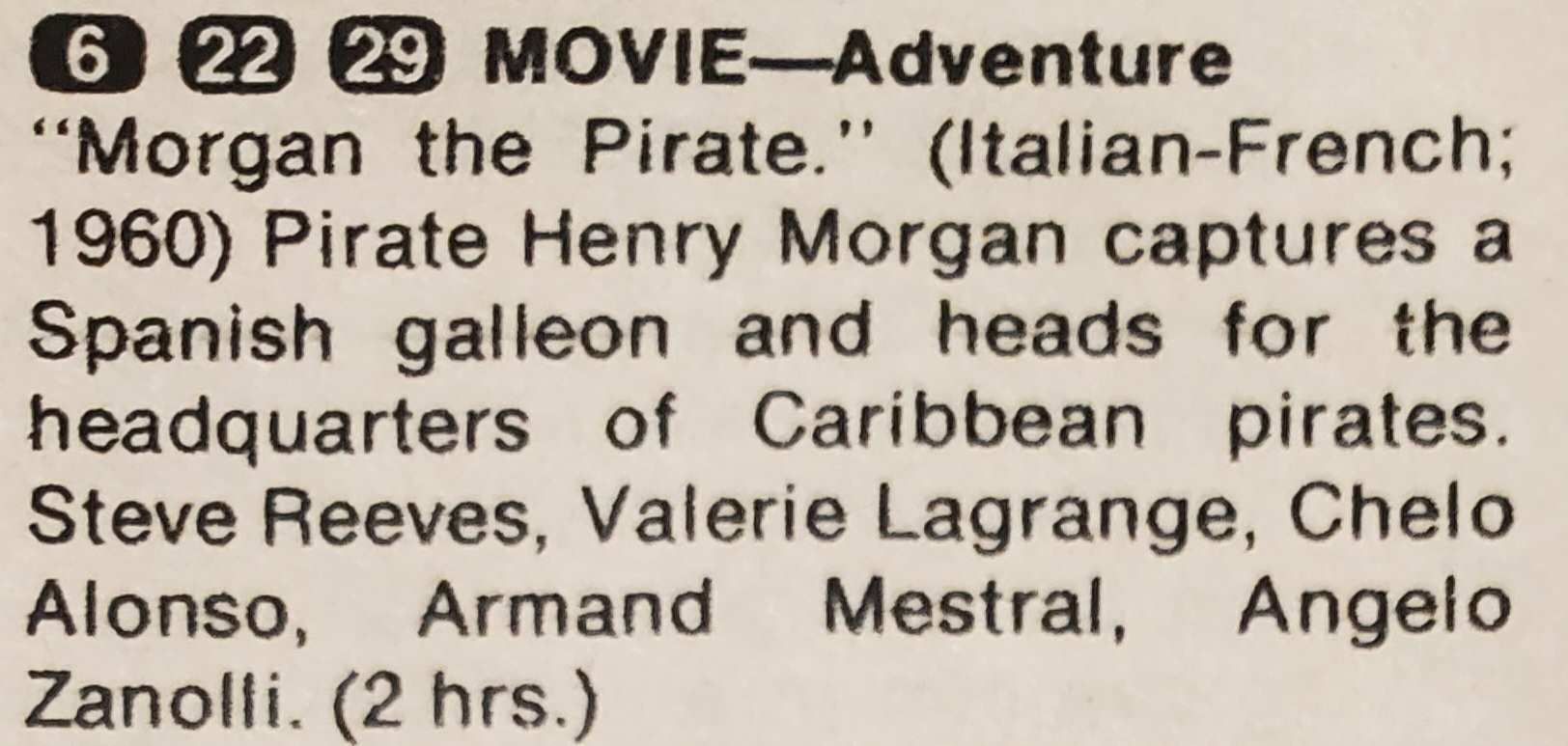 Over the dinner hour why not catch Steve Reeves flexing his biceps as Morgan the Pirate.