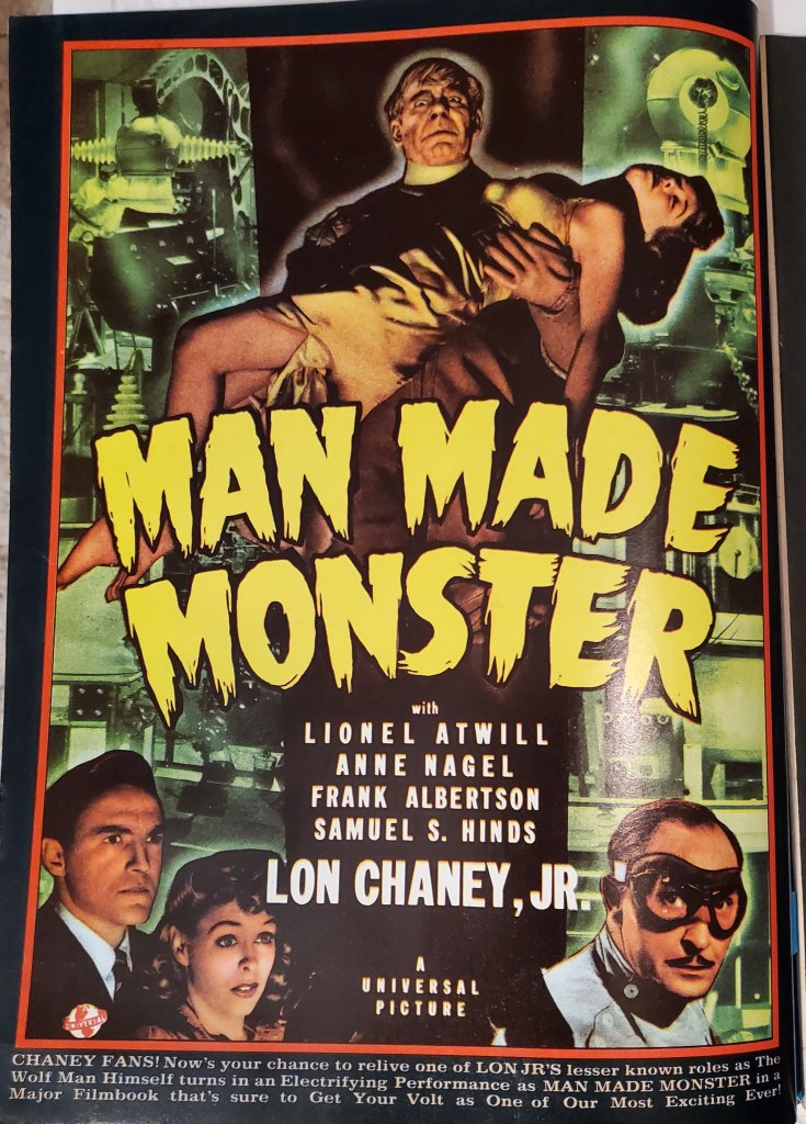 The first write up is a synopsis of Man Made Monster with plenty of accompanying photos. The film was made prior to Lon Chaney Jr.’s turn as Lawrence Talbot aka The Wolf Man. In this outing Chaney’s the likable guy being taken advantage of by a crazed scientist played by Lionel Atwill who turns Big Lon into Dynamo Dan who’s electrifying touch can kill.