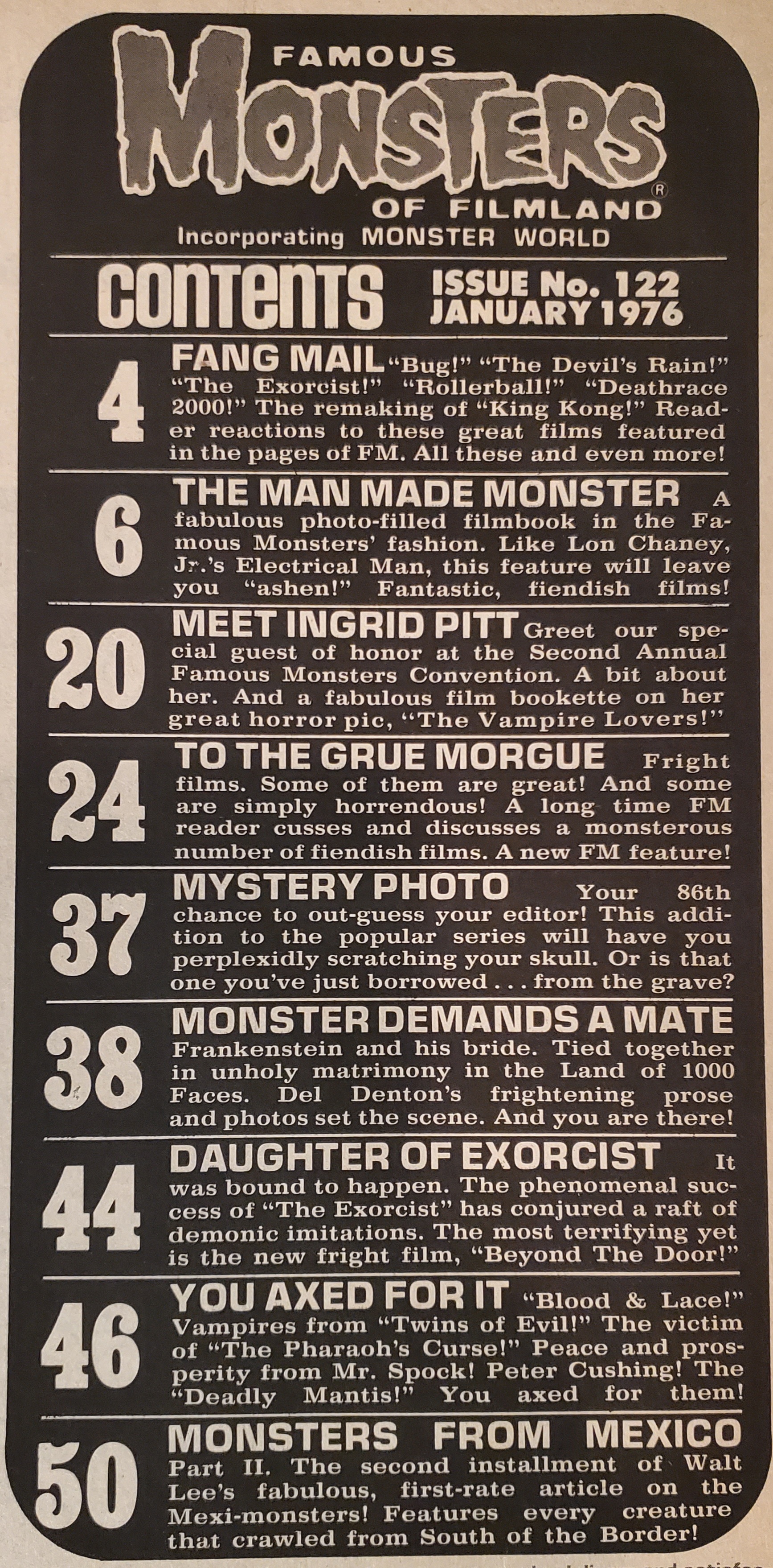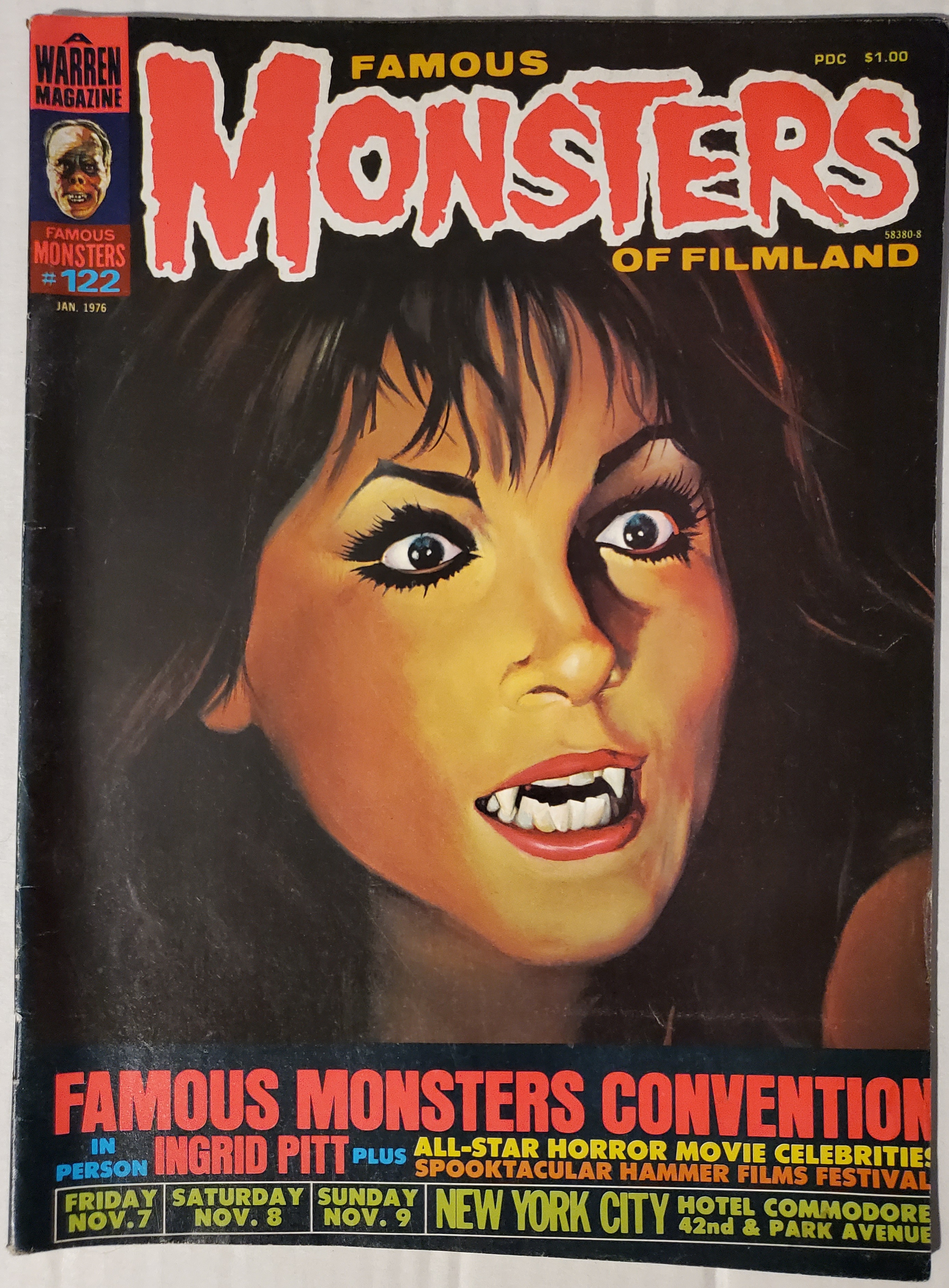 Let’s get started with Issue #122 from January 1976 of Forest J. Ackerman’s creation featuring cult fave Ingrid Pitt on the cover.