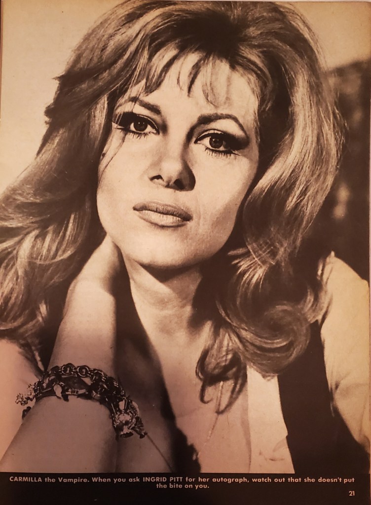 Cover Girl Ingrid Pitt get’s coverage in the aptly titled “You’ll Love this Vampire” For those unaware, Miss Pitt, played Le Fanu’s Carmilla in the Hammer classic, The Vampire Lovers. She also starred as Elizabeth Bathory in the studio’s Countess Dracula and proved to be one of the highlights in the Amicus anthology The House That Dripped Blood.