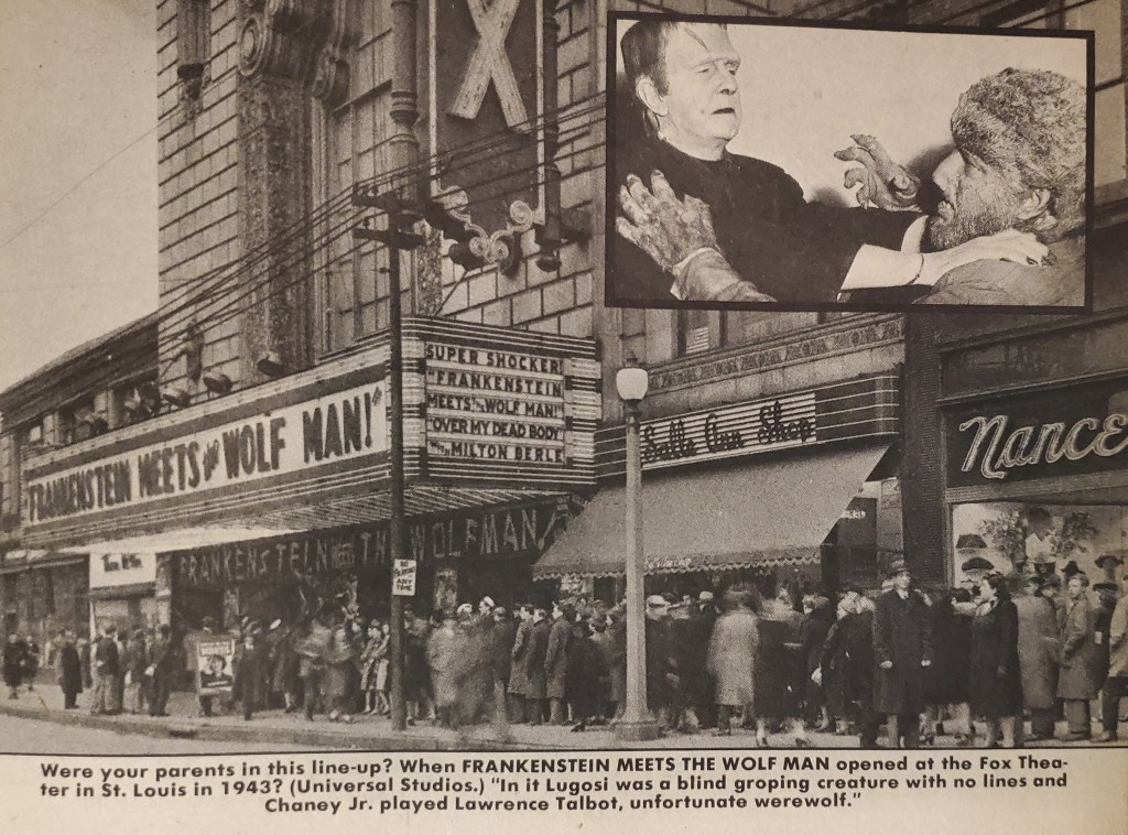 Hidden in the chapter titled To The Grue Morgue which serves as a Coles Notes version on the history of horror films is this shot of a movie theater in St. Louis playing the monster clash Frankenstein Meets the Wolf Man or if you prefer, When Bela Met Lon. Every time I see those old movie theater shots all I can think about are the posters and billboards that no longer exist. As for the co-feature, Over My Dead Body starring Milton Berle, never seen it but after a little research it sounds fun in a Red Skelton kind of way.