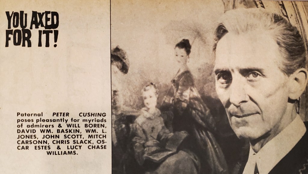 The “You Axed For It” chapter was a staple of Famous Monsters. While it might be hard to imagine nowadays, travel back in time to the days before the internet when you’re wanting to see a picture from a favorite horror film or possibly an actor we all identify with the genre. Like Peter Cushing. All you had to do was write into the publisher and make your request.