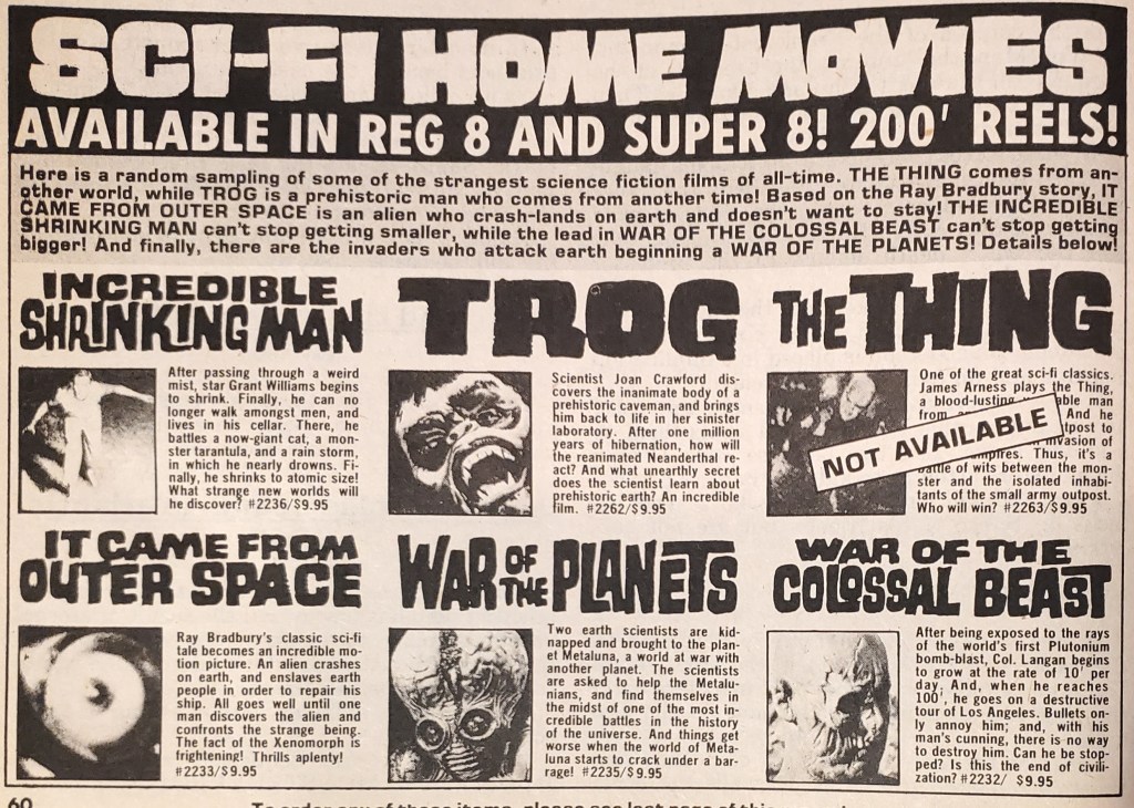 Be sure to order up some Super 8 home movies of the monster variety. While I never got any of these back in the day I did locate a stack of these on one of my memorabilia hunts.