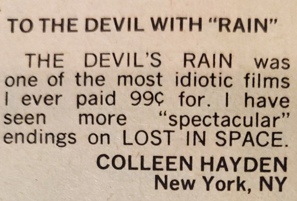New Yorker Colleen Hayden was indeed a bit harsh on Robert Fuest’s THE DEVIL’S RAIN (1975). And LOST IN SPACE ‘DID’ have some spectacular endings (and some corny ones too!) so don’t know what she was going on about there! lol