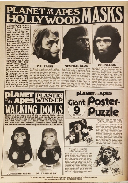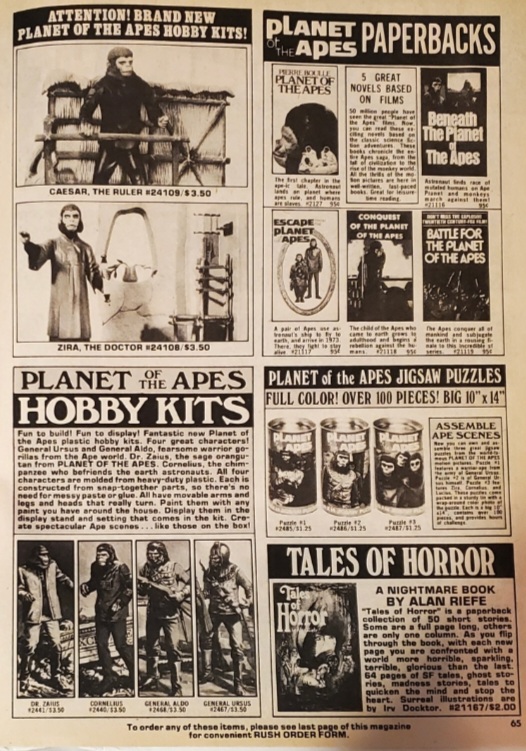 Two full page ads on Planet of the Apes novelties would have had me begging my parents for pretty much everything that was available for ordering. As a matter of fact I was gifted that giant floor sized puzzle of Roddy McDowall in full make up one Christmas morning. As for the paperbacks, I’ve picked them up over the years.