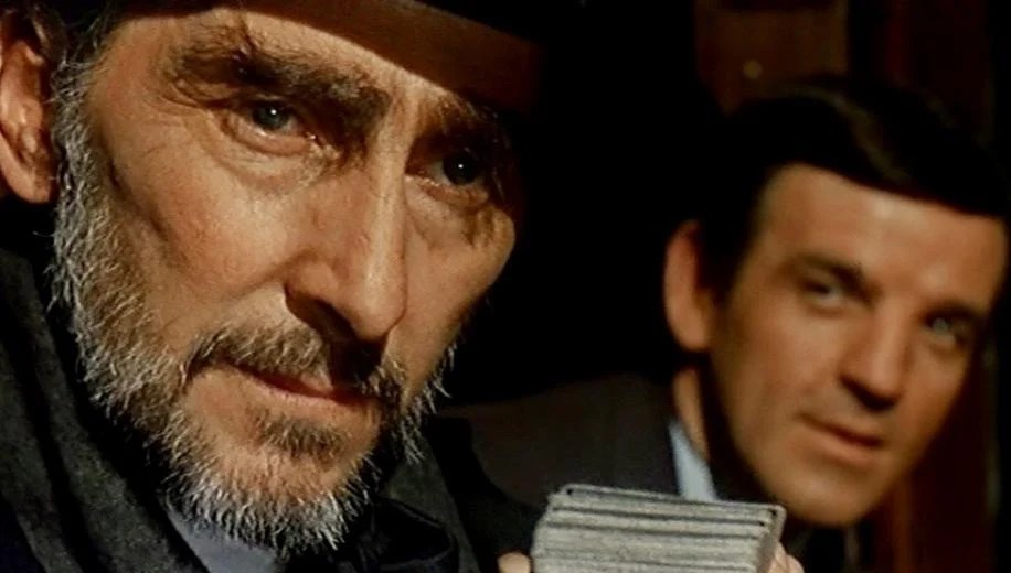The so-called “house of horrors” begins when Neil McCallum, Alan Freeman, Roy Castle, Christopher Lee and a very young Donald Sutherland find themselves seated together on an evening train. Joining them is Peter Cushing looking as if he’s a street urchin with the Red Skelton gloves to match. He’s darkly lit and heavily bearded. With him are his tarot cards which he conveniently drops opening the conversation for those around him to learn more about the cards and the futures they can foretell.