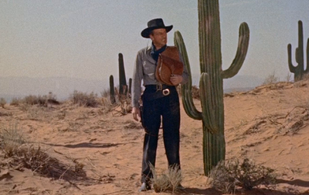 Milland sets the tone of this harsher than most westerns of it’s era by waiting a full 11 minutes until any dialogue is actually spoken. During that time we’ll see him riding through dry country in a sandstorm, having to put his horse down after a nasty tumble, feeding himself from the juice of a cactus and finally coming across what’s left of a savage attack on a stagecoach leaving very little to the imaginations of filmgoers in 1955. The massacre includes men, women and even a little girl.