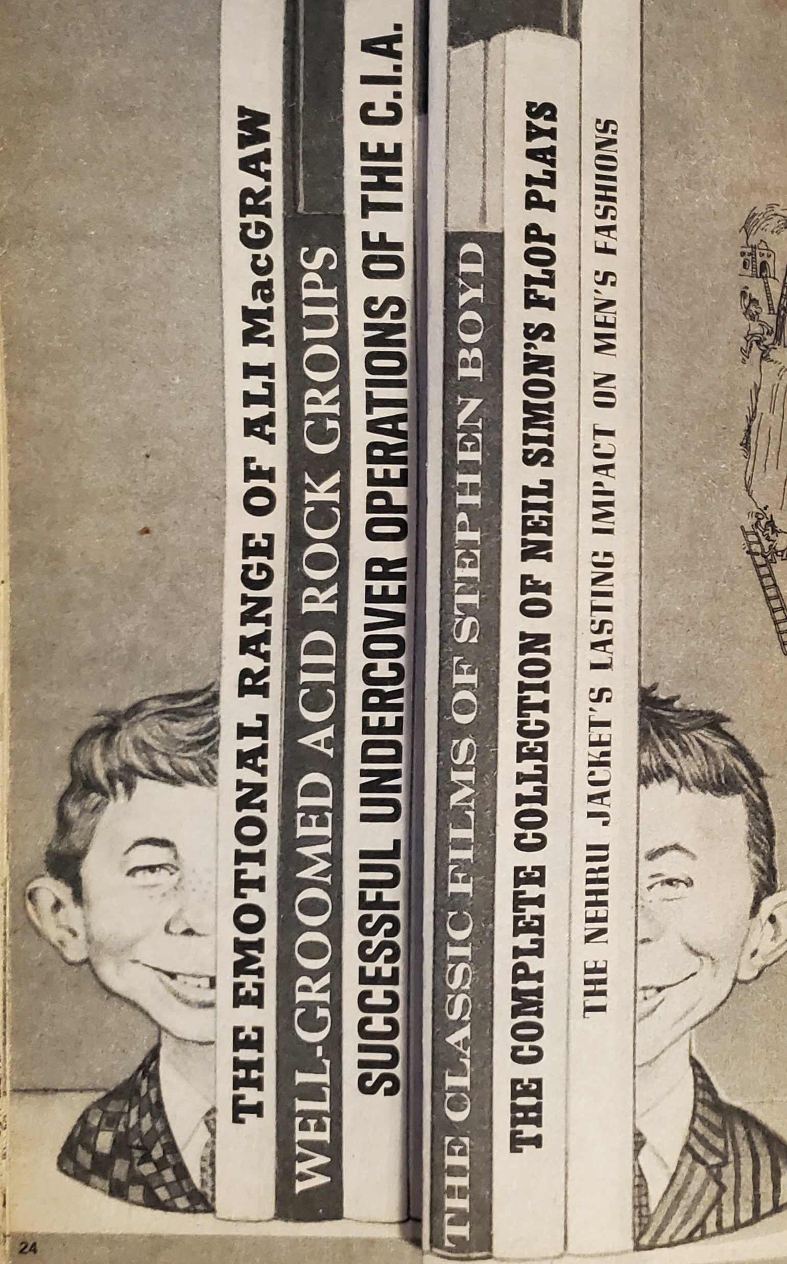 Under a collection of extremely THIN books we find cheap shots at both Ali MacGraw and Stephen Boyd while kind of paying tribute to Neil Simon.