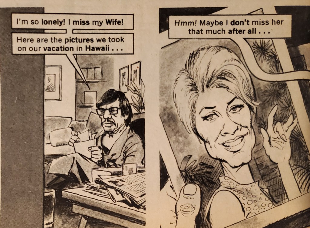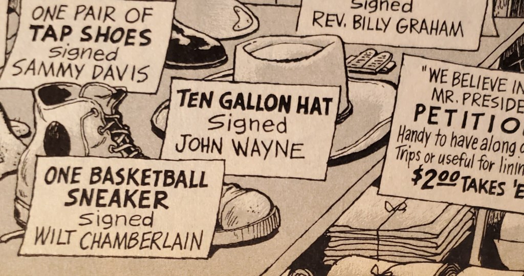 Coinciding with the resignation of Richard Nixon there’s a layout devoted to a White House Garage sale. Among the throwaways you’ll find are personally signed items from both Sammy Davis Jr. and John Wayne. If I get to the sale early enough I’m buying both and I’ll even grab them sneakers that Wilt the Stilt wore. After all, one man’s junk is another man’s treasure.
