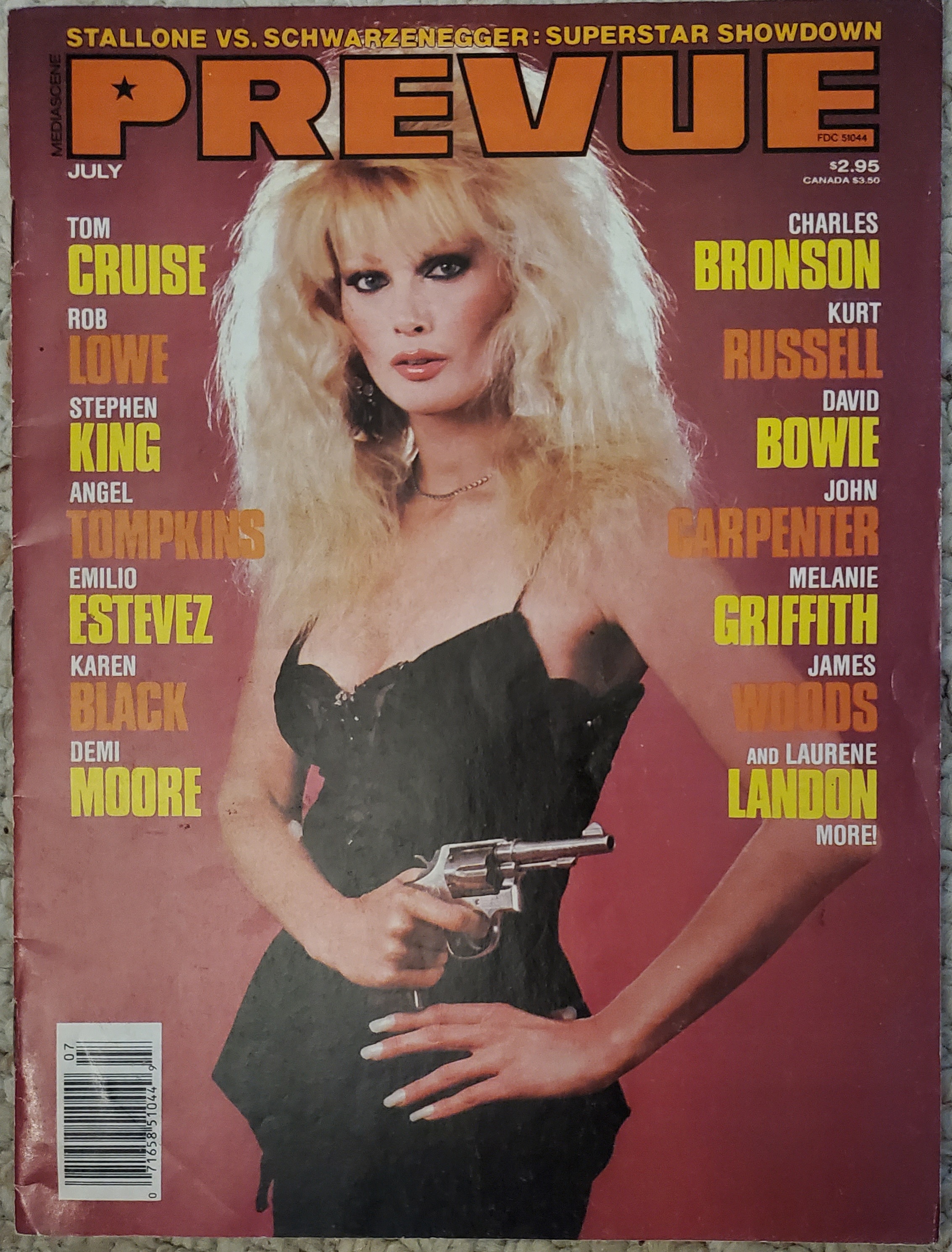 From what I dug up Media Scene Prevue magazine ran from 1972 thru to 1994. I have but a handful of issues tucked away and I guess it’s noticeable that the issues often featured attractive women in provocative poses on the cover much like a Hugh Heffner production. In this case, Laurene Landon. Among others you’ll see multiple covers with Sybil Danning. If not Sybil then maybe Bo Derek, Jane Seymour, Barbara Carrera, Maud Adams or Elvira Mistress of the Dark.