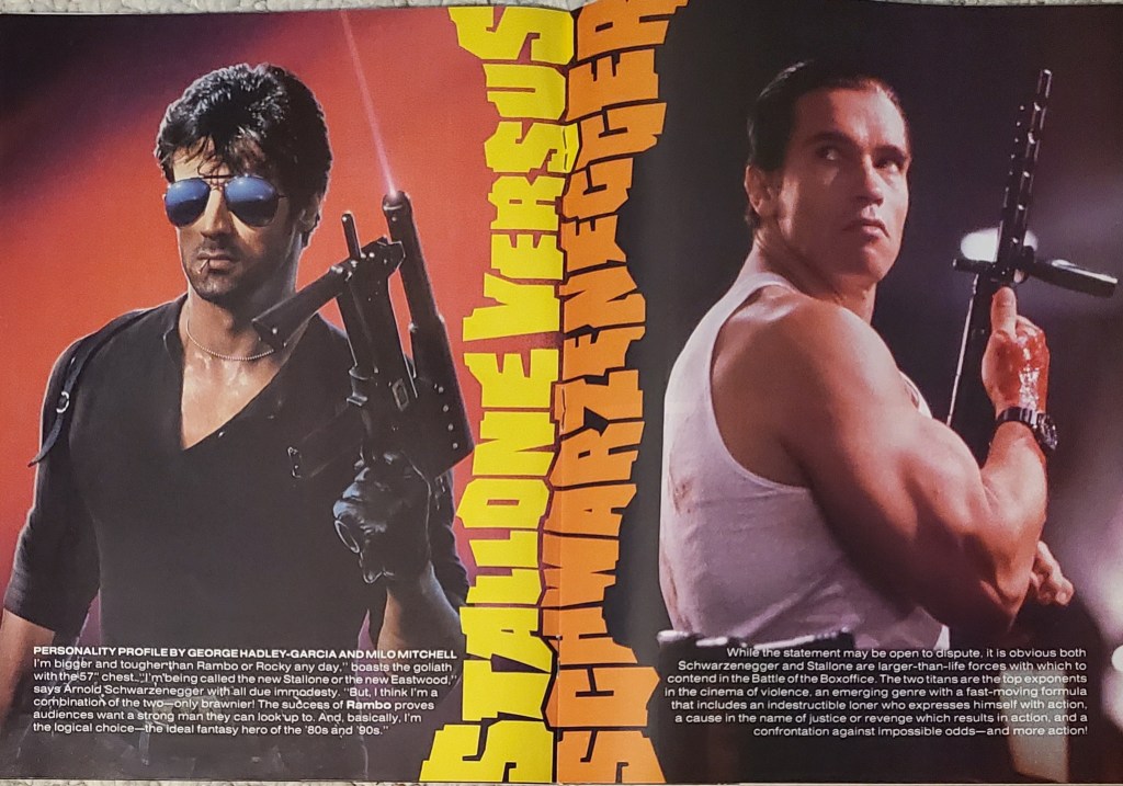 Plenty of quotes from our two he-men heroes toting oversized machine guns like this one from Arnie in referencing Sly’s writing scripts, “I might like to produce my own movies someday, but I have no time for writing and directing. I’m too busy living.” The article buys into pitting them against each other in the race for box office supremacy and ends with, “As the cinema of violence becomes a bloody, predatory battlefield, audiences will burn-out looking for the ultimate confrontation. After all the battles have been fought, the MIAs brought home, the criminals buried, only one final onslaught will remain to be staged. STALLONE vs. SCHWARZENEGGER. “