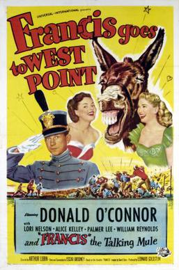 As in the famed Military Academy. I’ve never been there but Francis The Talking Mule has and I’ve seen the movie. Yes Francis Goes to West Point came out in 1952 which once again starred the unmistakable voice of Chill Wills as Francis alongside leading man and animal caretaker Donald O’Connor. It was the third film of the popular comedy series and costarred some upcoming talent from the “stable” of Universal Studios contract players like David Janssen, Lori Nelson and James Best.